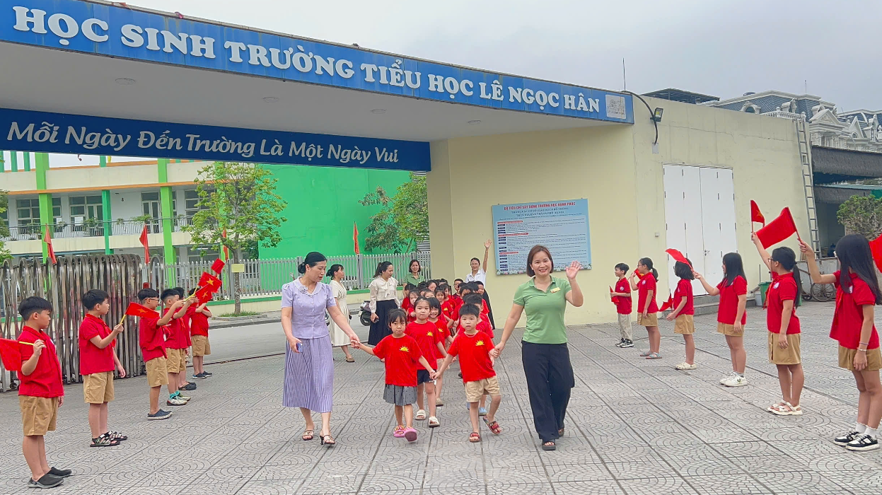 Các con học sinh trường Mầm non Bình Minh được cô Phó Hiệu trưởng Nguyễn Thị Hà cùng các cô giáo phụ trách lớp Mẫu giáo lớn, các bác phụ huynh đưa sang trường Tiểu học Lê Ngọc Hân tham quan trải nghiệm. Ngày hôm, nay, các con sẽ hoá thân thành những toa tàu để kết thành đoàn tàu bắt đầu khởi hành chuyến tàu "Em tập làm học sinh lớp 1". Các bé đã rất háo hức, gương mặt rạng rỡ, phấn khích khi được thầy cô dẫn đi tham quan một "ngôi trường lớn". Tại đây, các bé được các thầy cô giáo và anh chị học sinh trường Tiểu học Lê Ngọc Hân chào đón nồng nhiệt.