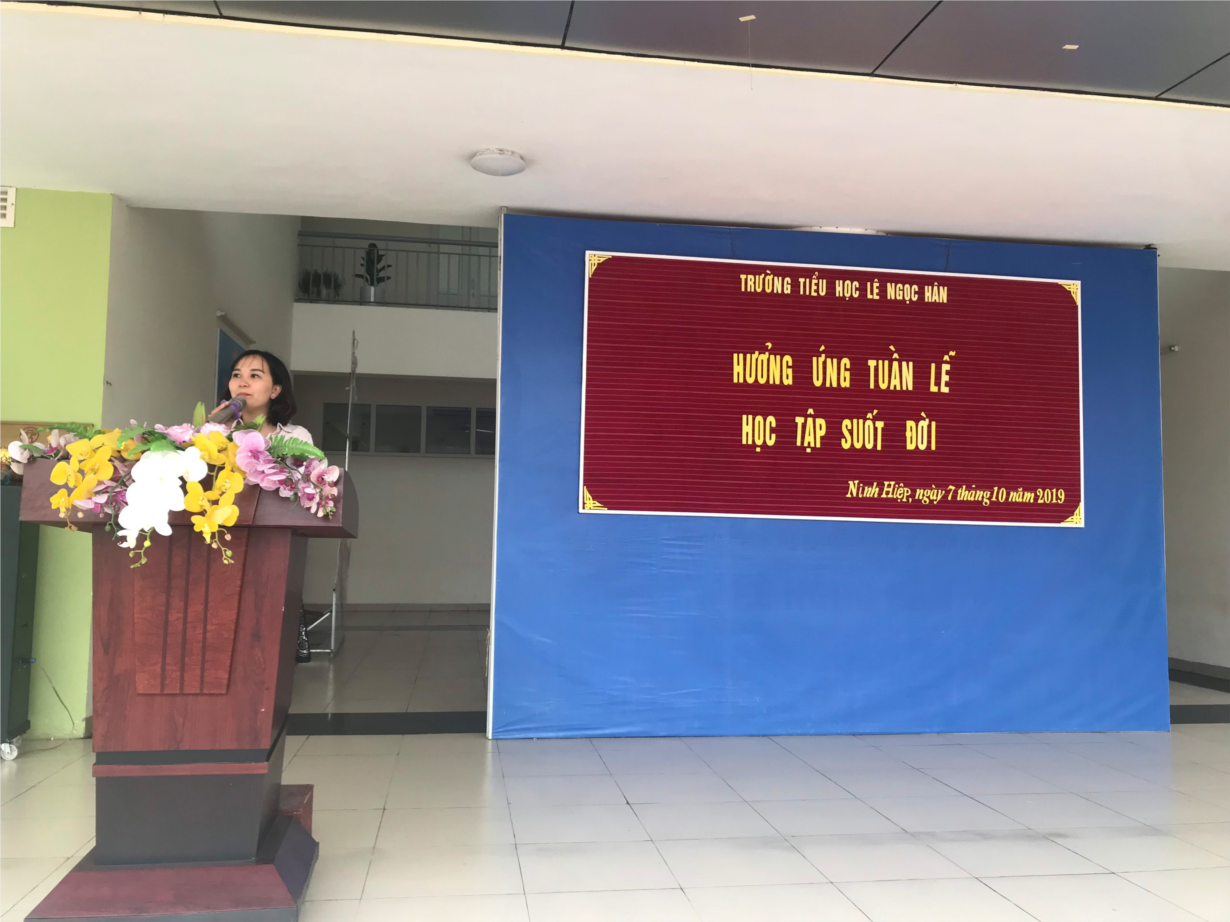 Sáng ngày 7/9/2019 trường Tiểu học Lê Ngọc Hân đã tổ chức hoạt động hưởng ứng “Tuần lễ học tập suốt đời”. Các hoạt động của “Tuần lễ hưởng ứng học tập suốt đời” được tổ chức từ ngày 1/10 đến hết ngày 7/10/2019 là dịp để chúng ta tiếp tục tôn vinh, gìn giữ và phát huy truyền thống hiếu học của dân tộc. Đây cũng là hình thức tuyên truyền nhằm nâng cao nhận thức của mọi Cán bộ, giáo viên, nhân viên và học sinh về học tập suốt đời và xây dựng xã hội học tập; là diễn đàn để các thầy cô giáo, các em học sinh chia sẻ, trao đổi kinh nghiệm trong dạy và học.