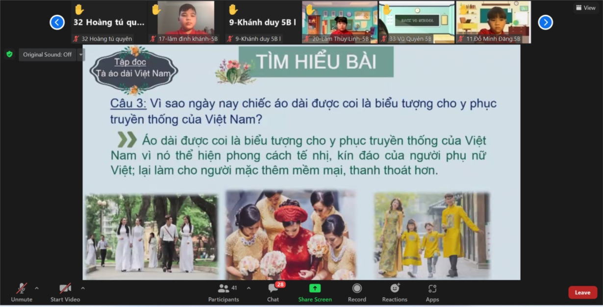 Với tình hình diễn biến phức tạp của dịch bệnh Covid -19 học sinh phải tạm dừng đến trường chuyển sang hình thức học online. Nhằm đổi mới phương pháp dạy học theo hướng phát triển năng lực học sinh và bồi dưỡng nâng cao chuyên môn cho giáo viên, vào chiều ngày 5/04/2022, Tổ chuyên môn khối 5 - Trường Tiểu học Lê Ngọc Hân đã tổ chức thành công tiết chuyên đề môn Tập đọc bài: Tà áo dài Việt Nam theo hình thức online do cô giáo Nguyễn Thị Hiền Anh giáo viên chủ nhiệm lớp 5B thực hiện.