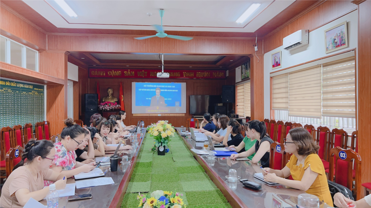 Hình ảnh tại điểm cầu Trường Tiểu học Lê Ngọc Hân tham dự Hội nghị Bộ Trưởng Giáo dục và Đào tạo gặp gỡ nhà giáo, cán bộ quản lí, nhân viên ngành giáo dục.