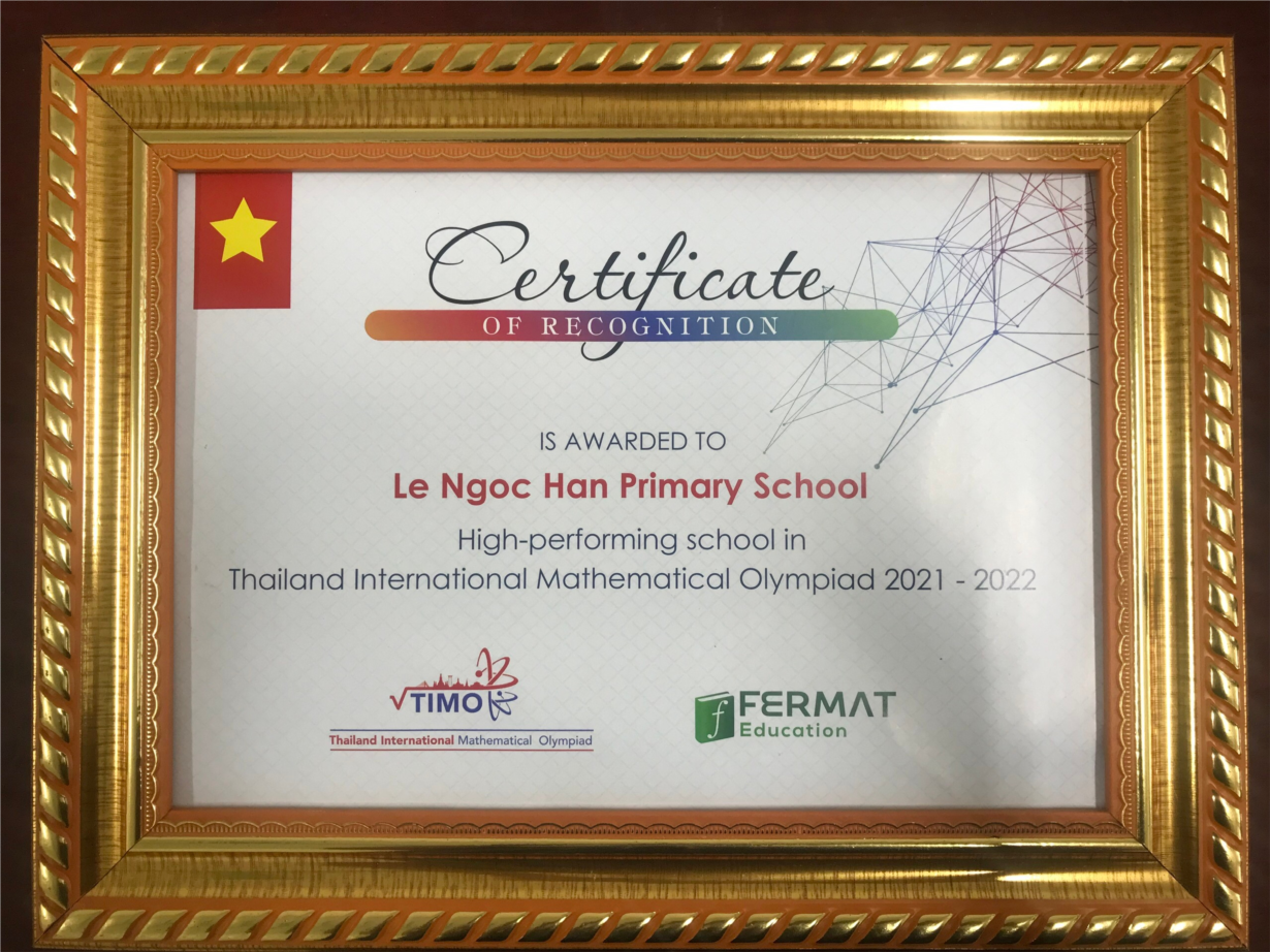 Nhà trường được Ban tổ chức Toán TIMO tặng giấy khen và Kỉ niệm chương về thành tích đạt giải của học sinh trong các kì thi Toán TIMO cấp Quốc gia, cấp Quốc tế. Đây là phần thưởng danh dự của các con học sinh đã dành tặng nhà trường.