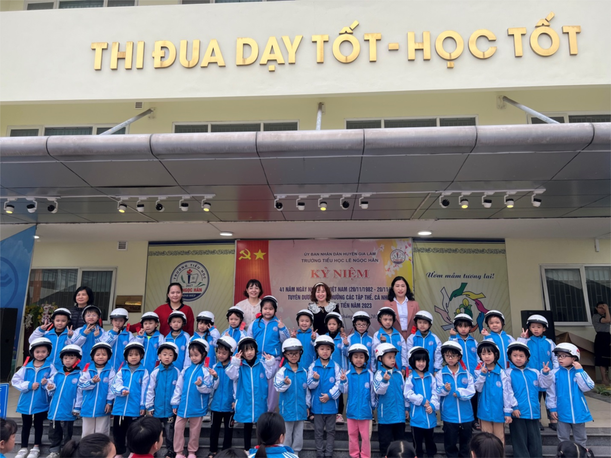 Cũng trong giờ chào cờ, toàn bộ các em học sinh lớp Một đã được trao tặng mũ bảo hiểm. Cô Trần Thị Minh Hiên cùng các cô giáo của các khối lớp đã thay mặt Công ty Honda Việt Nam trao tặng và hướng dẫn các con biết cách đội mũ bảo hiểm khi tham gia giao thông bằng phương tiện xe máy và xe đạp điện. Sự hân hoan của các bạn học sinh nhỏ tuổi khi được nhận quà khiến cho niềm vui của giáo viên và học sinh toàn trường như được nhân lên bởi một xã hội tốt đẹp!