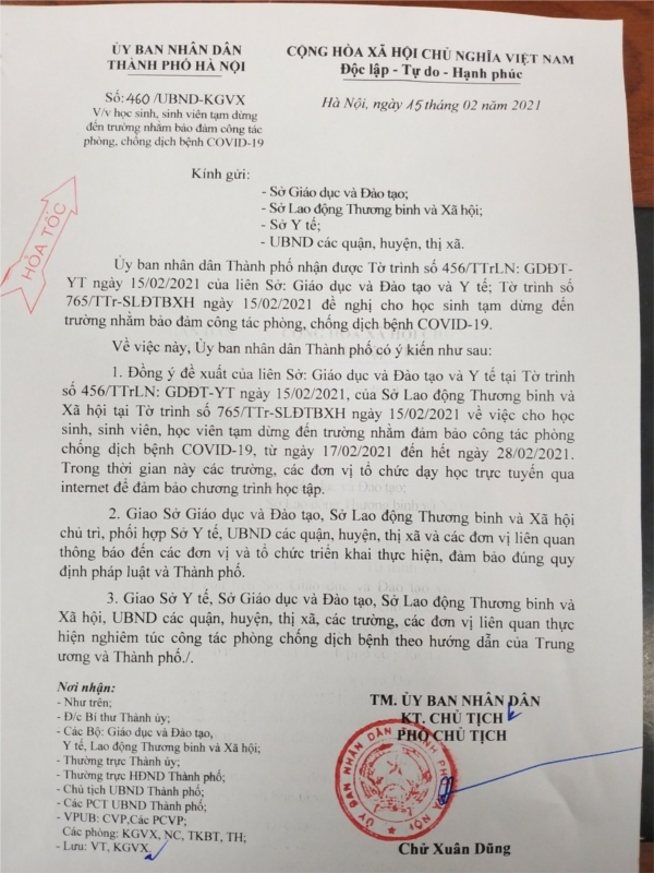 Căn cứ công văn số 460/UBND-KGVX của UBND TP Hà Nội về việc học sinh, sinh viên tạm dừng đến trường từ ngày 17/02/2021 đến hết ngày 28/02/2021 nhằm đảm bảo công tác phòng dịch Covid - 19, Ban giám hiệu trường TH Lê Ngọc Hân xin thông báo tới các bậc Cha mẹ học sinh và học sinh một số công việc cấp bách cần thực hiện như sau: