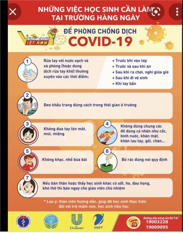 Tham mưu, phối hợp với trạm y tế bố trí nhân viên y tế trực tại đơn vị trong thời gian học sinh đến trường. Bổ sung thuốc chữa bệnh, các trang thiết bị y tế, phòng y tế. Nhà trường đã trang bị máy đo thân nhiệt để kiểm tra thân nhiệt cho 100% học sinh nhà trường theo hướng dẫn của ngành y tế. Khuyến cáo tới các bậc phụ huynh nên chuẩn bị nước ấm và binh nước cá nhân cho con em mình sử dụng, hạn chế sử dụng chung trong thời gian học tại trường. Tiếp tục tuyên truyền, tập huấn cho 100% CBGVNV và học sinh về phương pháp phòng, chống dịch bệnh bằng các hình thức phù hợp ngay trong ngày đầu tiên học sinh trở lại trường học; giáo dục, hướng dẫn học sinh thực hiện nghiêm các quy định y tế về vệ sinh cá nhân, vệ sinh môi trường, phòng, chống dịch dịch bệnh; đảm bảo toàn bộ học sinh được trang bị đủ kiến thức, thành thạo các kĩ năng cá nhân cần thiết để phòng chống dịch và tự chăm sóc bản thân. Thực hiện nghiêm túc khuyến cáo 5K “Khẩu trang - Khử khuẩn - Khoảng cách - Không tụ tập - Khai báo y tế”.