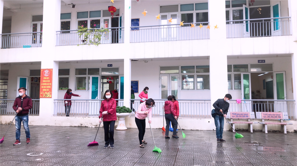 Ban giám hiệu các nhà trường đã huy động toàn thể cán bộ, nhân viên, giáo viên và một số học sinh, phụ huynh học sinh … cùng tham gia thực hiện. Các khu vực trong khuôn viên nhà trường như: lớp học, cầu thang, hành lang, khu vực nhà ăn, nhà đa năng, công trình vệ sinh và các khu vực ngoại cảnh, sân chơi… được quét dọn, vệ sinh sạch sẽ, thu gom bỏ rác, phế liệu; các vị trí như: nền nhà, bàn, ghế, bảng viết, cửa sổ, cửa ra vào, tay nắm cửa, tay vịn cầu thang,… được tổng vệ sinh, lau chùi sạch sẽ trước khi lau khử khuẩn bằng dung dịch Cloramin B; một số loại đồ chơi, học cụ…được ngâm khử khuẩn bằng dung dịch cloramin B hoặc chất tẩy rửa thông thường đặc biệt lưu ý những vật dụng tiếp xúc trực tiếp, thường xuyên với học sinh.