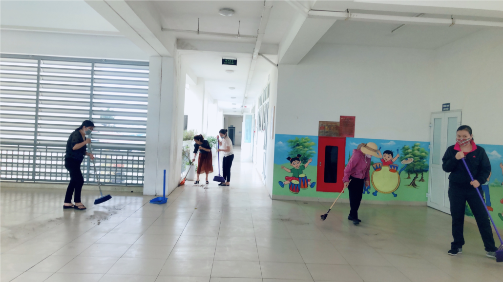 Hình ảnh các các thầy cô giáo vệ sinh khu vực hành lang lớp học.